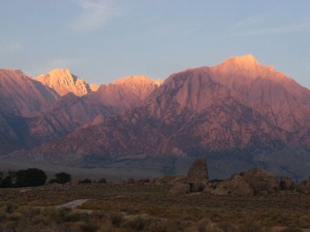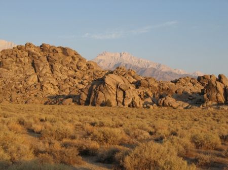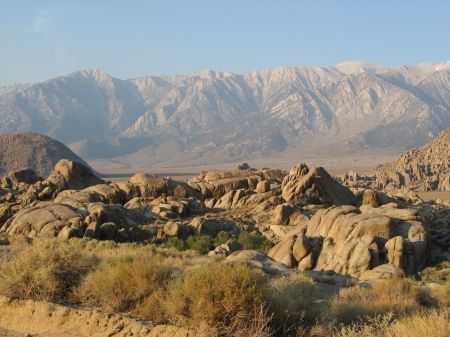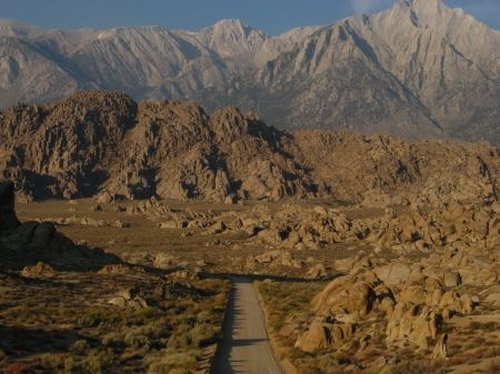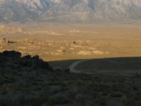 Wir standen ganz früh auf, um in die Alabama Hills zu fahren. Die Kinder hatten wir schon vorgewarnt und setzten sie einfach noch halb schlafend samt Schlafsack auf ihre Sitze. Dann fuhren wir in der Morgendämmerung ca. 10-15 Minuten über die Serpentinenstraße runter und bogen dann nach ein paar Meilen von der Whitney Portal Road auf die Movie Road ab. Die Kinder waren inzwischen hellwach und glücklicherweise trotz des frühen Weckens gut drauf.