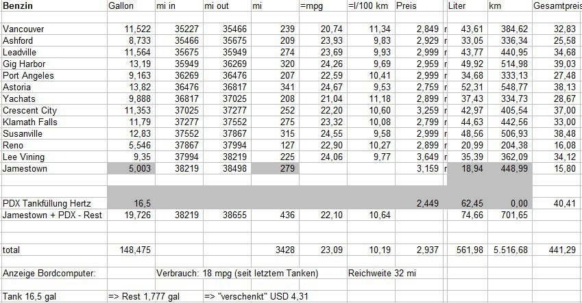 Die gegrauten Zeilen dienen der Hilfsrechnung für erste und letzte Tankfüllung. Mit 10,2 l/100 km bzw. 23 mpg lag der Verbrauch des Mariner kaum unter dem des letztjährigen Infiniti, aber weit unter dem des Trailblazer früherer Jahre. Der Benzinpreis wies große Schwankungen auf (2,449 - 3,649 USD, gewogener Durchschnitt bei 2,937 USD); am teuersten war der Sprit in Kalifornien, am billigsten ausgerechnet bei Hertz am Flughafen Portland.