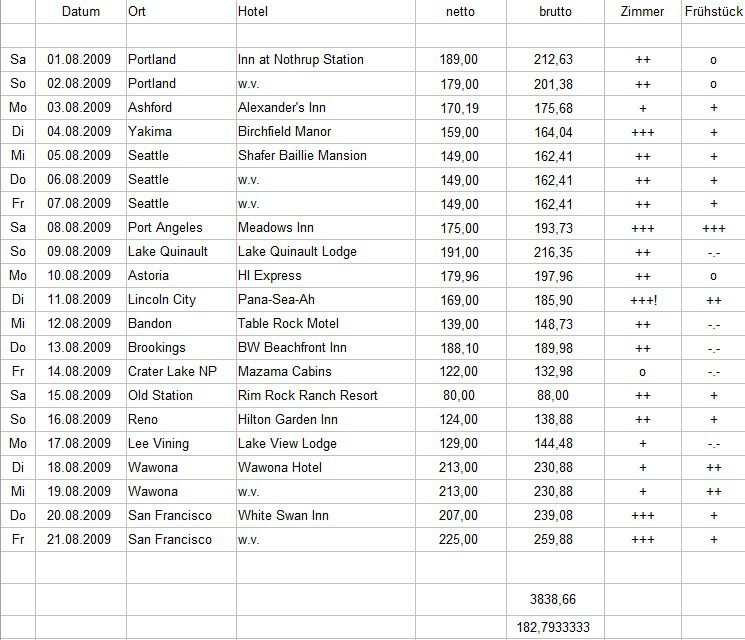Die Durchschnittskosten lagen mit etwas über 180 USD (inkl. Tax) diesmal schon ziemlich hoch. Das liegt zum Teil am hohen Stadtanteil, vor allem aber an dem hohen Anteil von B&Bs angesichts unseres zunehmendem Komfortbedürfnis. Auch wenn es sich meist nur um einzelne Übernachtungen handelt, wollen wir eine angenehme Umgebung um uns herum haben.