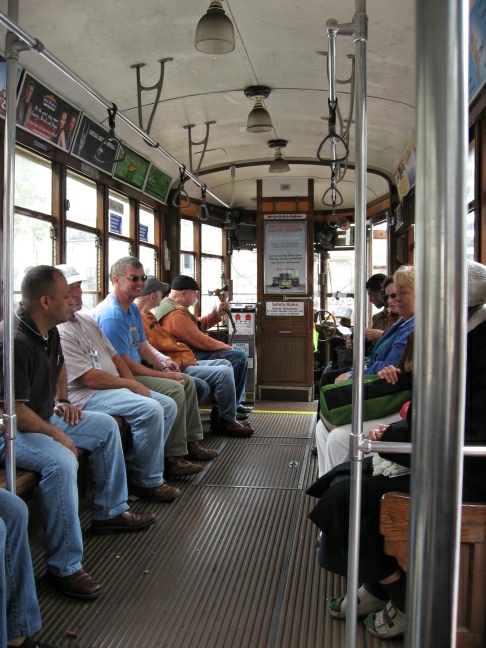 Dann beschließen wir, mit den Öffis zum Alamo Square zu fahren. Zunächst nehmen wir wieder die Tram („F“), die wir bis zur Endhaltestelle fahren wollten, um dort umzusteigen. Ein Stück vorher macht uns aber die Fahrerin darauf aufmerksam, daß sie im Moment nicht weiterfahren kann, weil wegen eines Unfalls die komplette Straße gesperrt ist. Also steigen wir bereits hier in den O-Bus um, der uns fast direkt zum Alamo Square bringt.