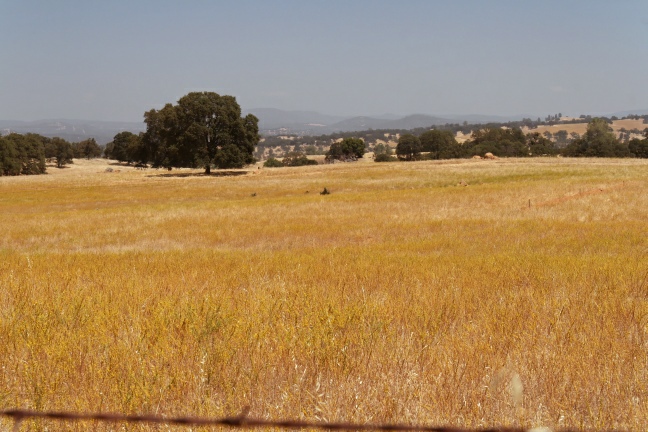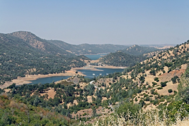 Schließlich fahren wir aus dem Park heraus. Auch diese Strecke zieht sich – wir müssen erst ein ganzes Stück Richtung Tioga fahren, bevor wir dann den Park verlassen und durch Berg und Tal bis Moccasin fahren, wo an großen Stauseen einiges an Wassersport stattfindet. Dorthin führt uns eine steile Serpentinenstrecke zunächst einen Hügel hinauf und anschließend heftig wieder hinunter. Nach einem kargen Picknick aus unseren Resten an der nächsten kleinen Paßhöhe nehmen wir Kurs durch die Pomeroy Landscape. Lauter Wiesen, die in der Sonne wunderschön golden leuchten.