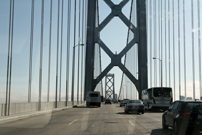 Die Weiterfahrt nach San Francisco geht dann durch das flache Sonoma Valley voller Obstplantagen. und unendlichen Windparks auf den Hügelketten. Ab etwa 50 Meilen vor San Francisco wird der Verkehr ziemlich dicht und zunehmend hektisch. Wir fahren über die Bay Bridge, die 4 USD kostet, und zum Glück noch offen ist. Kurze Zeit später sollte sie für Reparaturarbeiten geschlossen werden. Da kurz darauf einzelne Kabel rissen, wurde sie dann nochmal gesperrt.