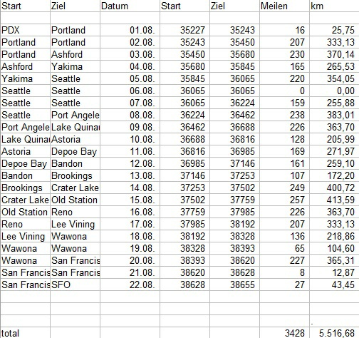 Die Strecken sind einschließlich aller Umwege und Einkaufsfahrten zum Supermarkt etc vom Kilometerzähler jeden Abend abgelesen. Maximum bei etwa 250 mi, ansonsten an den Reisetagen keine wirklich extremen Schwankungen wie in den Vorjahren (zwischen 100 und 250 mi). Durchschnitt ohne An-, Abreise- und stationäre Tage bei etwa 190 mi, damit kaum weniger als bei unseren letzten (Süd)westtouren 2005 und 2006 (je etwa 200 mi), aber deutlich mehr als unsere Südwestreise im Vorjahr. Trotzdem kam es uns einigermaßen entspannt vor - wohl auch wegen der relativ gleichmäßigen Streckenverteilung, die uns jeden Tag ausreichend Zeit für Besuchs- und Wanderaktivitäten ließ. Die 8 Meilen in SFO resultieren übbrigens aus dem Valet Parking.