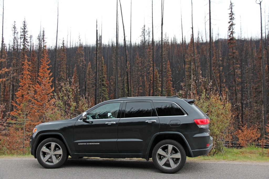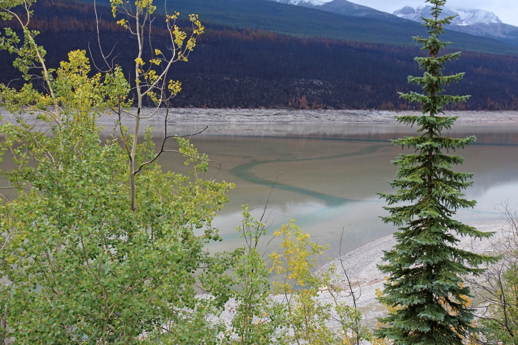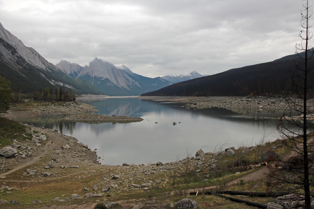 Es ist wieder einmal stark bewölkt und kühl, aber – wenigstens im Moment – trocken. Wir begeben uns auf die Fahrt zum Maligne Lake. Da wir am heutigen Feiertag (heute ist kanadischer Labour Day) keine Parkplatzprobleme bekommen wollen und der Verkehr auch recht heftig ist, fahren wir zunächst am Maligne Canyon vorbei und direkt zum See, um oben noch Platz zu bekommen. Die Fahrt auf einem schmalen Sträßchen führt mitten durch ein Waldbrandgebiet.