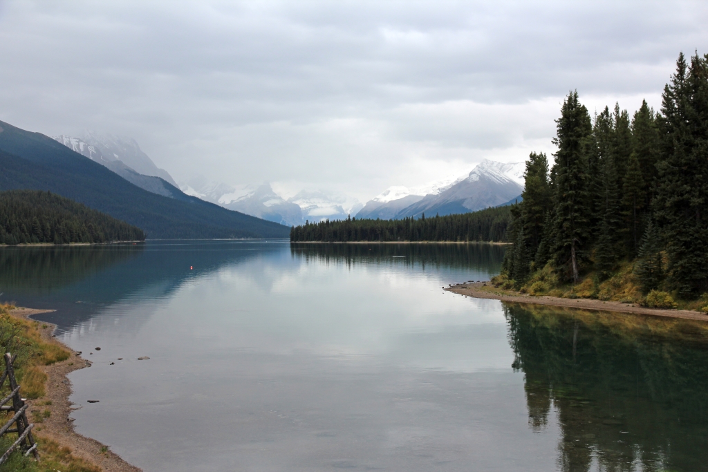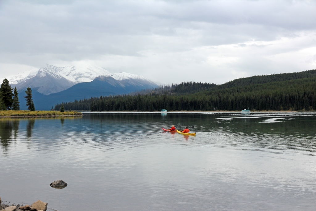 Auf dem See herrscht reger Betrieb von Kanufahrern und vor allem von den Ausflugsbooten, die die Leute bis zur Spirit Island bringen, einem der berühmtesten Fotomotive des Jasper NP. Wir können uns nicht vorstellen, daß die Tour von 90 Minuten über den See bei tief hängenden Wolken wirklich etwas bringt, und verzichten deshalb auf die Ausgabe von 67 CAD pro Kopf für ein zweifelhaftes Unterfangen.