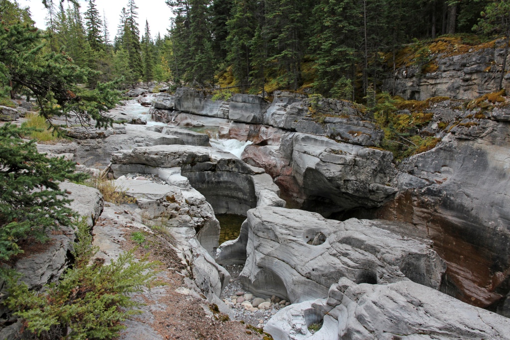 Beim ersten der Waterfowl Lakes gehen wir wieder ans Ufer und bewundern den Schilfgürtel. Der Nebel hängt hier besonders niedrig über dem See. Beim zweiten See stoppen wir nur kurz an der Straße. Anschließend gehen wir den kurzen Weg zum Mistaya Canyon, wo sich der Bach tief ins Gestein gegraben hat. Oberhalb des Wasserfalls kann man direkt ans Ufer gehen und man realisiert, mit welcher Wucht das Wasser an einem vorbeischießt.