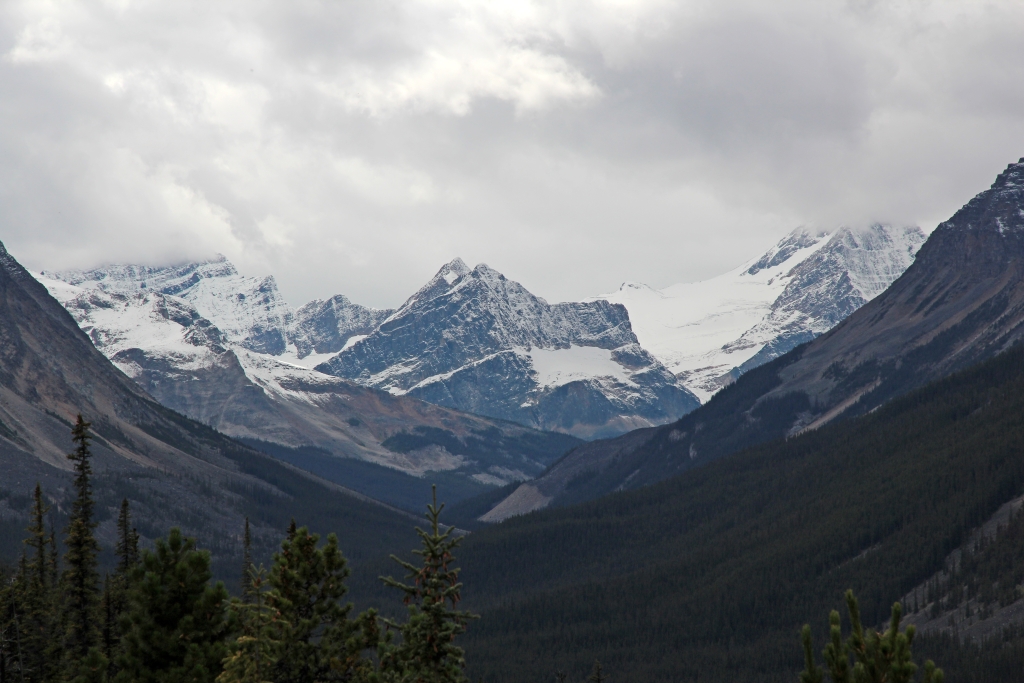 Wir fahren somit den Icefield Parkway wechselnd durch Schneefall und Regen mit vielen kurzen Stops – mal mit Aussteigen und mal ohne.