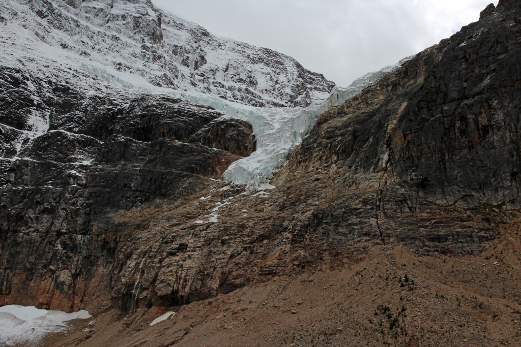 Mt Edith Cavell - unten der Cavell Glacier mit dem Cavell Pond; oben etwa zu Beginn des rechten Bilddrittels sind neben dem Ausläufer des Angel Glacier die Reste des Ghost Glacier, von dem 2012 ein großer Teil heruntergebrochen ist
