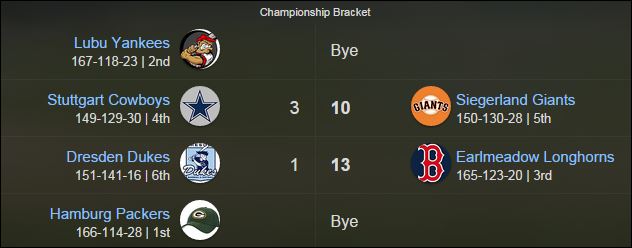 Von dieser Stelle aus viel Glück den verbleibenden Teams um den Titel. In meiner WildcardPartie gegen Siegen führte ich bis Fraitag Nacht - am Samstag wurde ich dann förmlich abgeschlachtet. Hab dann zwar am Sonntag noch etwas dagegenhalten können, hat aber nciht gereicht. War für mich eine verkorkste Saison mit vielen Höhen und Tiefen - hab aber dennoch das Beste draus gemacht und bin sogar nach der Regular Season noch 4. geworden.
