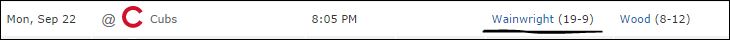 Habe gerade gesehen, dass ich bei momentaner Rotation bei den St.Louis Cardinals, Adam Wainwright um einen Tag verpasse in Chicago gegen die Cubs. Das ist natürlich schade.  :(