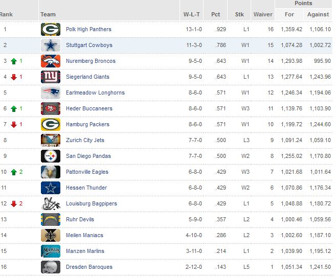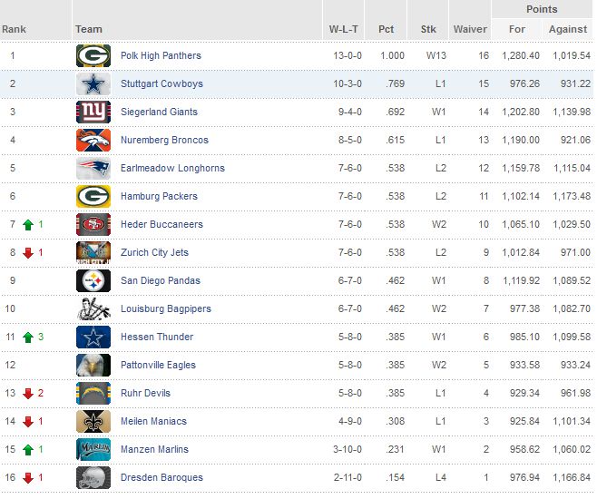 Nach der Niederlage vom letzten Wochenende, werde ich diese Woche wohl wieder einen Sieg einfahren können. Obwohl ich zur Zeit noch knapp 2 Punkte hinter meinem Gegner liege, bin ich äusserst optimistisch. So spielt heute Nacht noch meine gesamte Panthers-Fraktion mit Newton (QB), LaFell (WR) sowie Gano (K). Irgendwie sollten es diese 3 Spieler fertig bringen, die benötigten 1.92 Punkte zu ergattern.