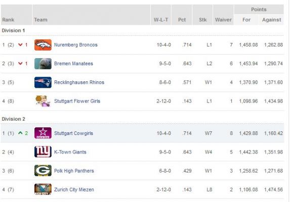 Da in Liga 1 die 4 besten Teams sich für die Playoffs qualifizieren, hab ich die Gesamttabelle gepostet. Dennochsollte erwähnt werden, dass ein starkes Nord-Süd-Gefälle zu sehen ist und mit 2 Schweizer und einem Schwäbischen-Team eine Übermacht darstellt. Somit müssen sich die Hamburger als einzigste Vertreter der Nord-Divsion die Fahnen des Norden hoch halten  :lol: