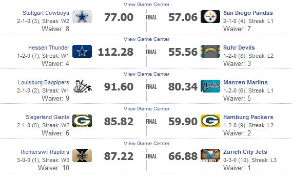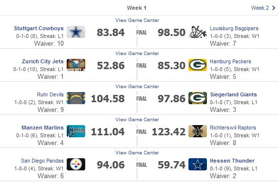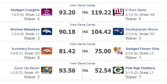 hmm, weis nicht, was ich mit meinen beiden Teams anfangen soll . . . muss mich erstmal mit meinen Teams auseinander setzen. Konnte seit den Drafts kaum ein Auge drauf werfen - ich weis nur, dass ich den ein oder anderen Spieler doppelt habe. In Liga 2 hab ich jetzt Foles gegen Romo tauschen können, Danke Micha!!