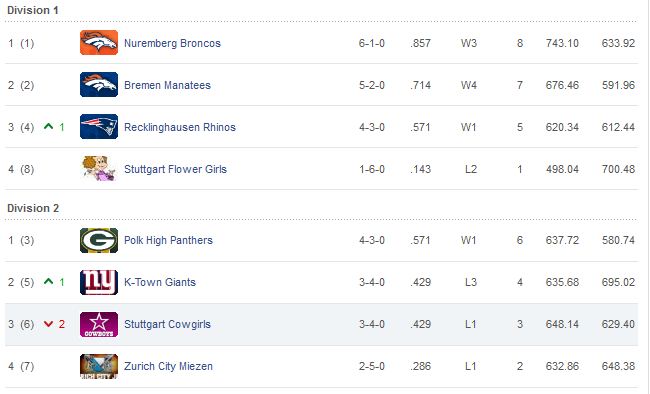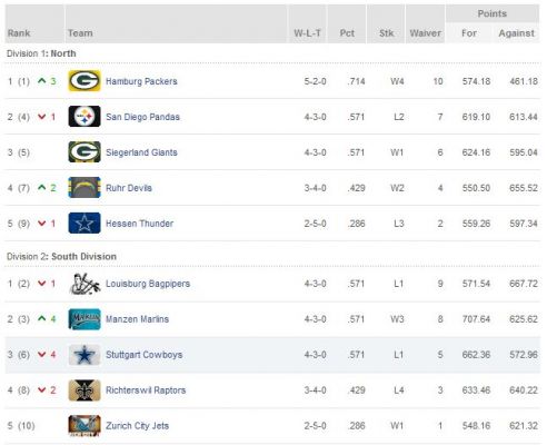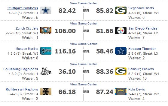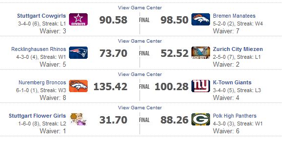 hmmm, ich bekomme einfach keine gleichbleibende Leistung hin - ein totales Auf und Ab bei mir. Zudem fehlen mir in beiden Teams meine wichtigsten Leute (Calvin Johnson und Adrian Peterson) . . . Ich will aber nicht meckern, denn gerade bei den WR ist immer sehr viel Glück dabei.