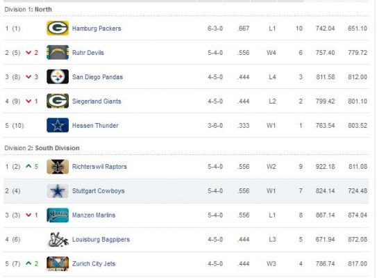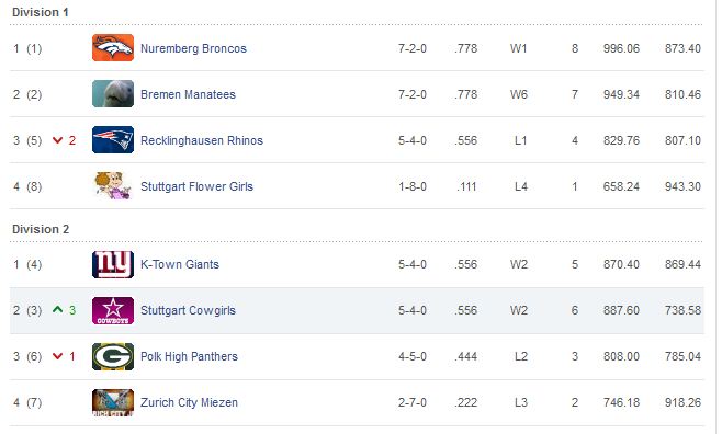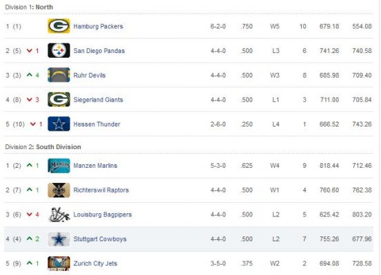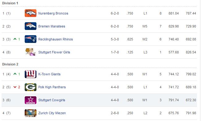 Trotz der Niederlage bleiben die Hamburg Packers (6:3) vorne - allerdings ist das Feld nun noch weiter zusammengerückt. Alleine 4 Teams stehen mit 5:4 in Lauerstellung, gefolgt von 3 weitern Teams mit 4:5. Lediglich die Mannschaft aus Hessen steht mit 3:6 am Ende der Tabelle.