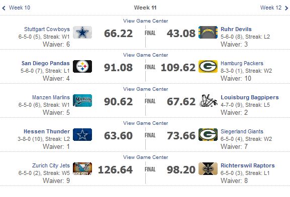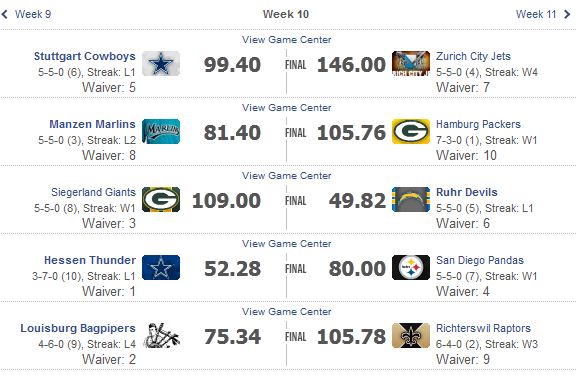 Ich muss meine Prognose wohl revidieren. Dank der Akquirierung von einigen guten FA wie Matthews, Beckham und Forsett bin ich wieder voll im Rennen. Im Coach Ranking sogar #1. Letzte Woche habe mir mir ausserdem noch Josh Gordon geholt, der nächstes Wochenende nach einer Suspendierung wieder mitspielen darf. Gordon war letzte Saison Leader in Receiving Yards und schlägt hoffentlich auch diese Saison wieder voll ein. Projected werden für ihn für den nächsten Spieltag schon einmal stolze 20 (!) Punkte. Wir werden sehen.  8)