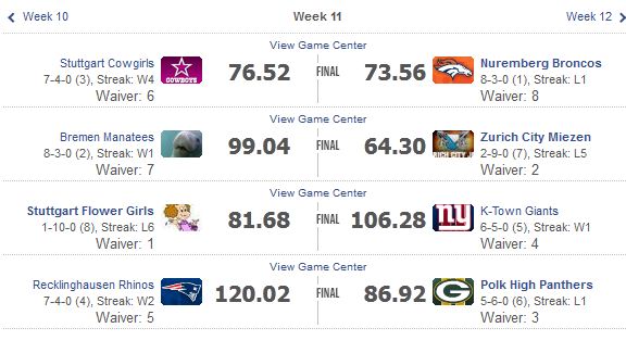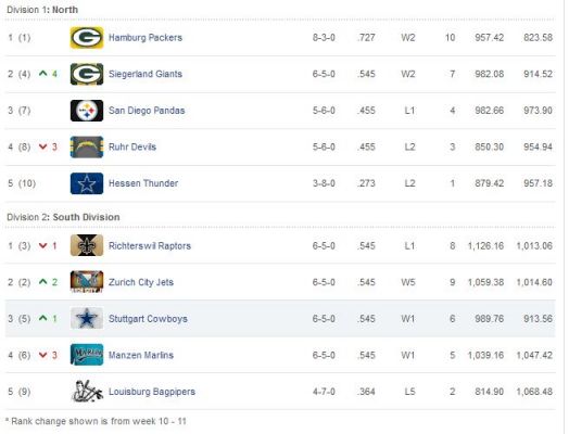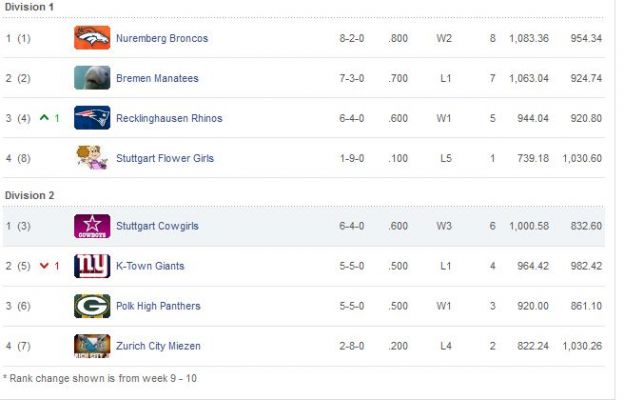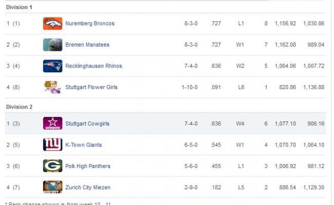 Den Broncos kann man praktisch zum Einzug in die Playoffs gratulieren. Alle anderen Teams dürfen sich noch Hoffnungen machen - für die Flower Girls und die Miezen wird das allerdings schwer werden.