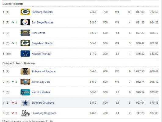 Ganze 6 Teams mit 5:5! Das Feld ist noch sehr eng beinander - lediglich die Packers können sich schon fast über eine sichere Play Off Teilnahme freuen!! Die kommende Woche steht ganz im Stern des schweizer Derbys Zürich City Jets gg. Richterswil Raptors!