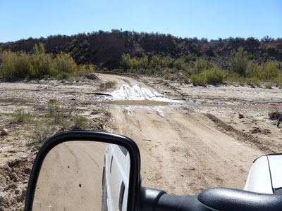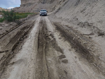 Bei uns sah es letztes Jahr 24.09.2011, 7 Tage nach Regenfall so aus.  Sieht harmlos aus, aber an zwei Stellen (ca. 15m und ca. 10m lang), entlang am Cottonwood River,  für PKW mit niedriger Bodenfreiheit, durch tiefe Spurrillen im trockenem Wash, gefüllt mit feinen Sand, absolut nicht passierbar....