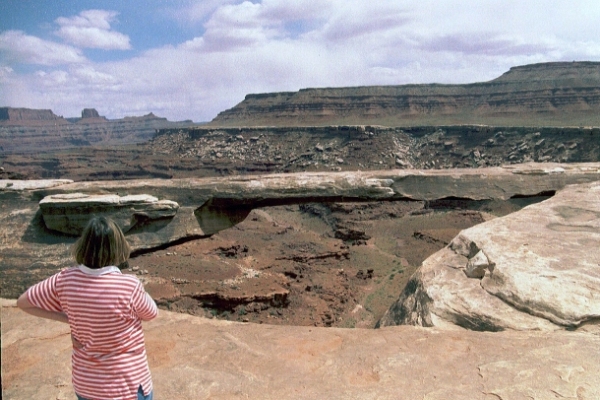 Martina schaut skeptisch auf den Musselman Arch im Canyonlands NP!