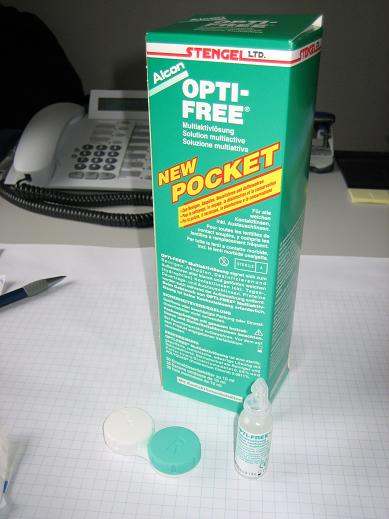 Also habe ich mich heute in der Stadt auf die Suche nach KLF (Kontaktlinsenflüssigkeit) in kleinen Gebinden gemacht mit folgendem Ergenbis: Apollo-Optik hatte als kleinste Flasche eine mit 60ml. Ein anderer Optiker hatte 100ml, aber auch noch eine ganz andere Möglichkeit: