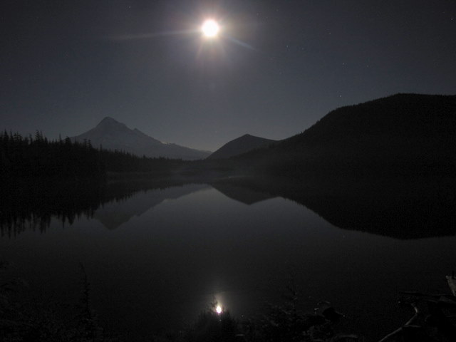 Als Besipiel mal ein Bild dass das Problem zeigt: ich musste natuerlich lang genug belichten, um den Berg und den See einigermassen deutlich auf das Bild zu bekommen, dafuer ist der Mond jetzt keine fahle Kugel mehr, sondern eher wie eine grelle Sonne. (Ein "Sternchenfilter" waere da bestimmt ein netter Effekt gewesen, da mein Verschluss keine schoenen Sternchen macht)