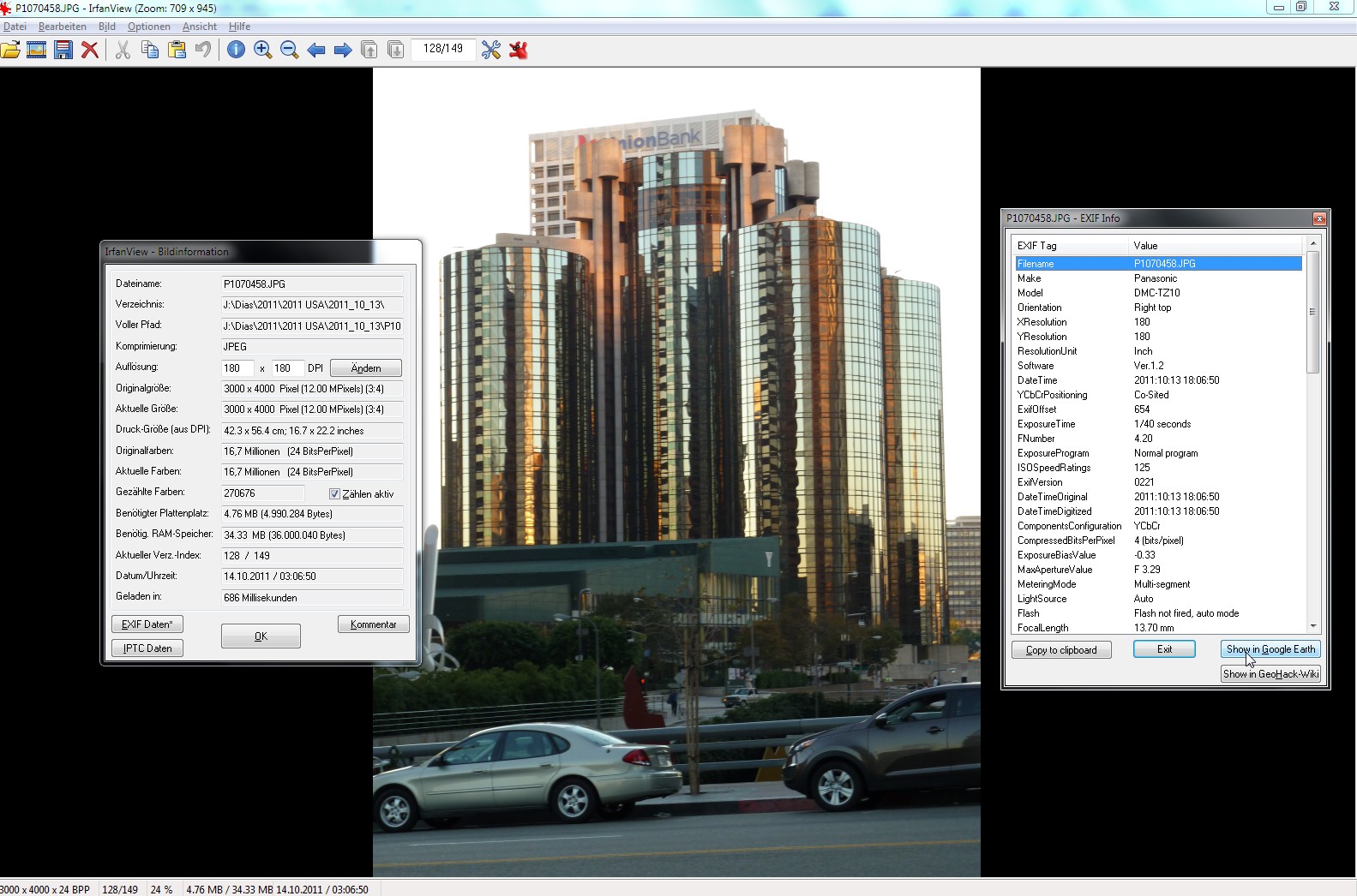 Man öffne das Bild mit IrfanView, klicke oben auf "I", dann öffnet sich das Fenster "Bildinformation", dort klickt man auf "Exif-Daten und ein weiteres Fenster öffnet sich:
