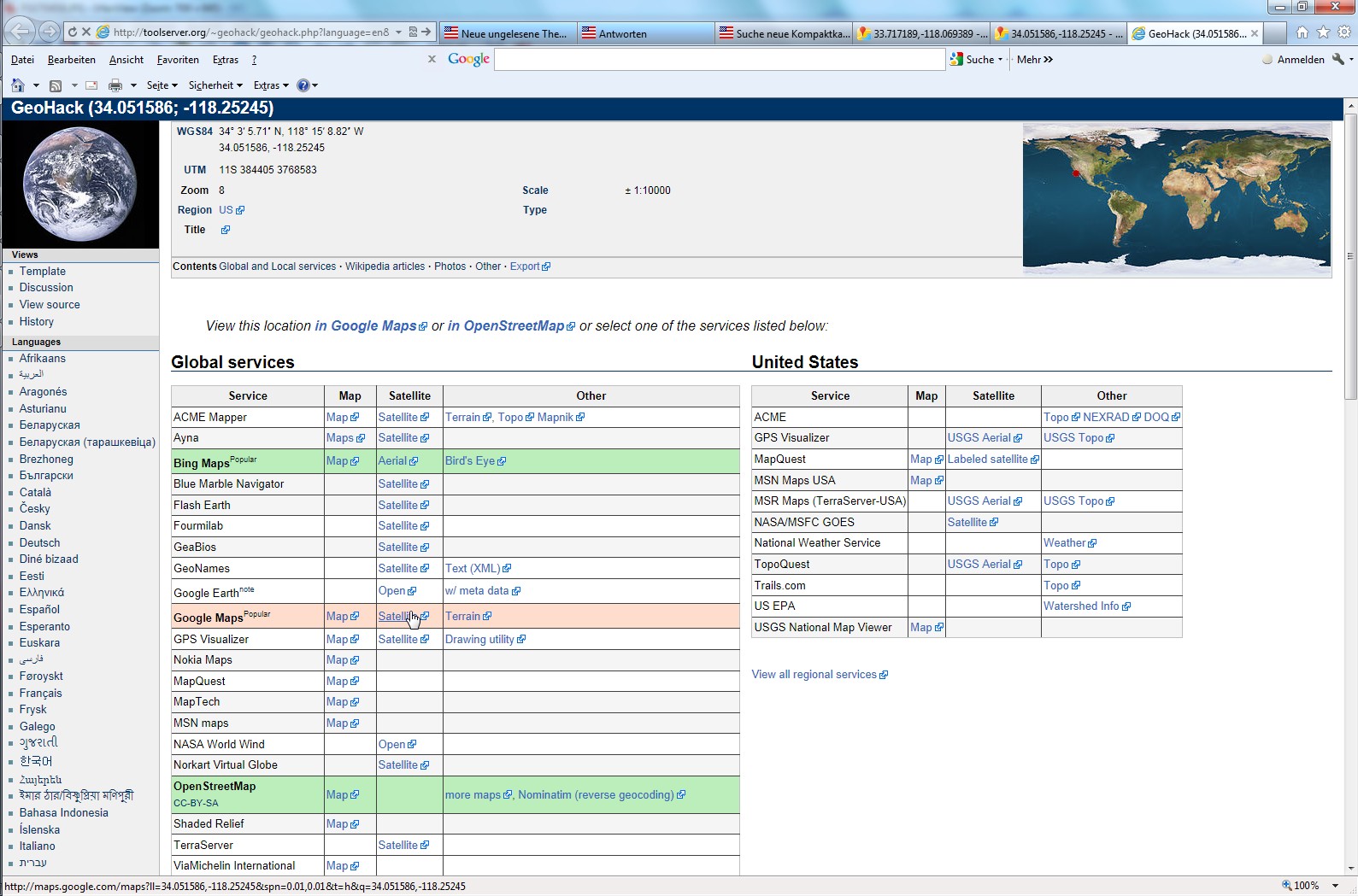 Man klickt im EXIF-Fenster auf "View in GeoHack Wiki" und eine große Auswahl von Kartensoftware öffnet sich:
