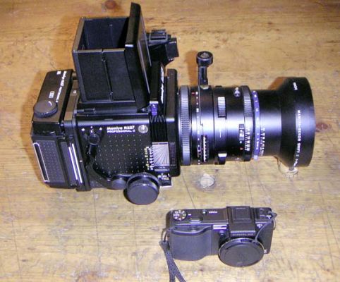 RZ67II mit Lichtschacht, 120er-Magazin und 2,8/110 Objektiv, neu, unbenutzt, originalverpackt für 990 Euro gegen das kleine im Vordergrund für 380... bei Analog gibt's noch richtig was fürs Geld ;-)