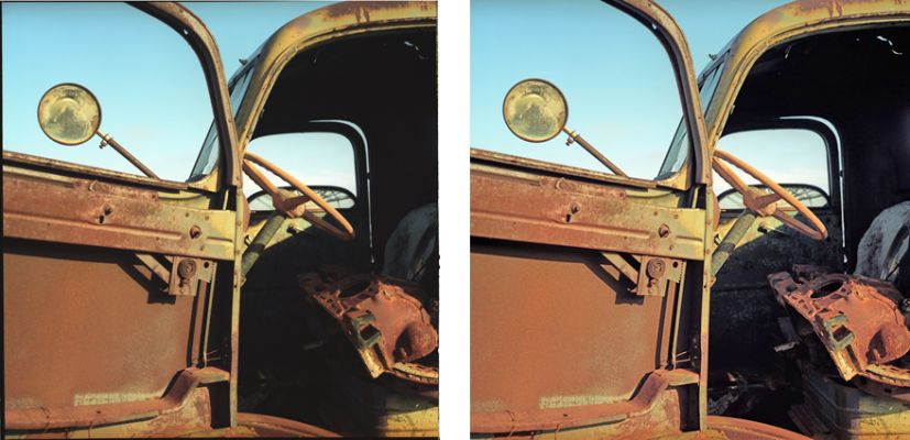 Doc's Beispiel folgend zeige ich hier auch mal den Rohscan (links) und die Bearbeitung - hier sieht man recht gut die Wirkung des Tiefen-Lichter-Werkzeugs und die Zunahme der Tiefen durch eine Anhebung von Schwarz per selektiver Farbkorrektur. Außerdem wurde der Kontrast etwas verstärkt (per Histogramm). Natürlich hier auf 72 dpi runtergerechnet (ohne Nachschärfen) - die Datei hat eigentlich rund 250 MB, weil sie für einen Ausdruck in 150x150 cm gescannt wurde.
