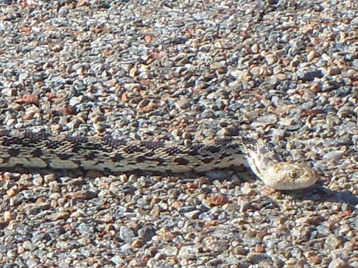 weißt du denn auch, was das hier für eine ist? Eine Rattlesnake glaube ich nicht, so weit ich´s an der Kopfform sehe, oder? Ist die erste Schlange, die mir tatsächlich in freier Wildbahn begegnet ist, die lag einfach auf dem Highway und sonnte sich, war sicherlich länger als 1 Meter und gab ihren Platz auch nicht auf, als ich im Rückwärtsgang nochmals Unruhe verbreitet habe und wieder an sie herangefahren bin.