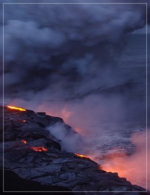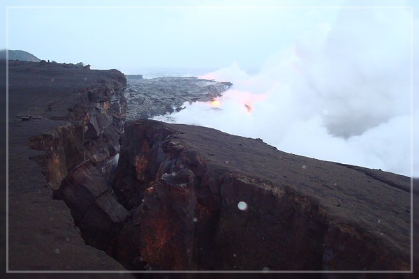 Nicht einen einzigen Lavastrang haben wir gesehen. Nicht ein einziges Foto mit der glühenden Lava geschossen. Aber nun der Reihe nach. Treffpunkt war wie bekannt die Kirche in Kapalana um 3.45 am. Die Aussage, dass Chris nur mit untereinander bekannten Personen auf das Lavafeld geht, trifft nicht zu, denn neben uns war noch ein uns unbekanntes Pärchen dabei. Bei der Ankunft an der Viewing Area meinte Chris: What's that. I can't see any glow. Das verhieß schon nichts Gutes. Und tatsächlich, es gab keine Lava zu sehen. Nur ein paar glühende Austrittsstellen. Nun denn, da es heute so ruhig wie schon lange nicht mehr war, meinte Chris, können wir es auf die Bench wagen. Also wir die erste Bench herunter und dann die zweite. Wir sind über wenige Tage alte Lava gelaufen und Chris meinte dies wäre die Lava, die wir noch vor wenigen Tagen von der Viewing Area gesehen hätten. Dann standen wir direkt an einer der vor sich hin glühenden Austrittstellen direkt am Wasser. Wie gesagt, es kam aber keine Lava heraus. Ich sag Euch, meiner Frau und mir war teilweise ganz schon mulmig zu mute. Es heißt doch immer "Don't go on the bench". Als dann hinter einer kleinen Erhebung plötzlich Rauch zu sehen war und Chris sich selbst fragte, ob es Rauch oder nur eine große Welle war und meinte "We better go up", sind wir wieder hoch gegangen. Dabei hat er ein ganz schönes Tempo vorgelegt. Wir haben noch ein wenig geguckt aber es tat sich nichts mehr. Chris meinte die Lavatube ist verstopft und sucht sich einen anderen Weg (so haben wir es jedenfalls verstanden). Es könne heute Nachmittag vielleicht schon weiterfließen. Aber heute war an der Viewing Area nichts zu sehen. Die Ranger haben die Besucher gleich am Eingang darauf aufmerksam gemacht. Leider war der Verkaufstand mit den schönen Lavabildern auch nicht mehr da, so dass wir auch kein schönes Bild mehr kaufen konnten.