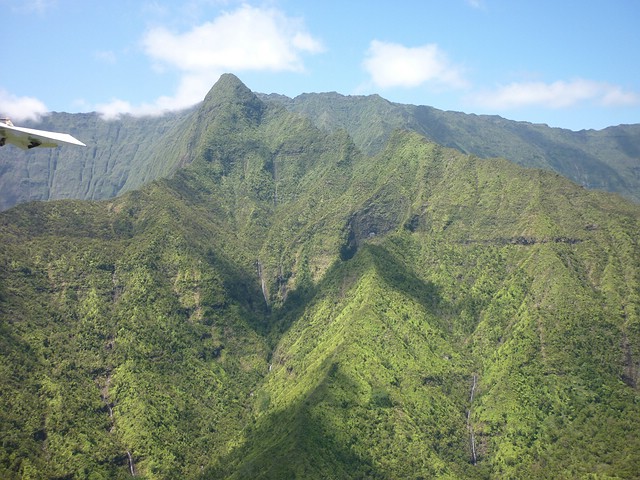 Der spitze Berg im linken oberen Bildviertel ist der Kawaikini, mit 5243 ft. die höchste Erhebung von Kaua'i. Der Mt. Wai'ale'ale ist mit 5.148 ft. nur unwesentlich niedriger. (Angie)