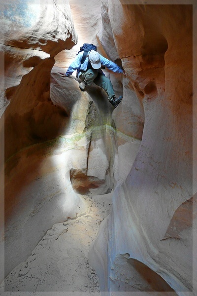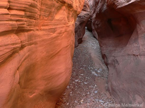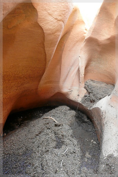 Lustig ist, dass wir später in der Fotogalerie von „Helge“ (hier aus dem Forum) unser kleines gebogenes Stöckchen auf der Gumpe, das wir uns vorhin gemerkt haben, wieder gesehen haben. Wir haben es nämlich bei unseren Tests drauf geworfen und offenbar (wie es sich später herauskristallisierte) war Helge mit seiner Frau am selben Tag bis hier her gelangt – bloß von der Mündungsseite des Canyons, mit Start ab Hole in the Rock Road. Die Welt ist eben klein :winke:!