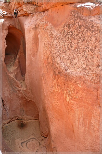 Lustig ist, dass wir später in der Fotogalerie von „Helge“ (hier aus dem Forum) unser kleines gebogenes Stöckchen auf der Gumpe, das wir uns vorhin gemerkt haben, wieder gesehen haben. Wir haben es nämlich bei unseren Tests drauf geworfen und offenbar (wie es sich später herauskristallisierte) war Helge mit seiner Frau am selben Tag bis hier her gelangt – bloß von der Mündungsseite des Canyons, mit Start ab Hole in the Rock Road. Die Welt ist eben klein!