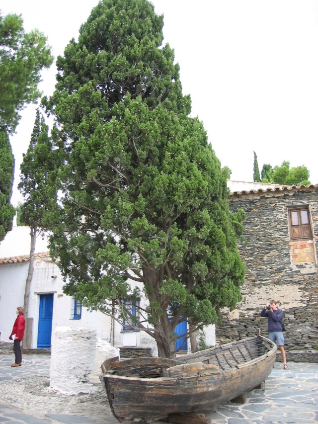 Beim früheren Wohnhaus von Dali in Port Lligat (Casa Salvador Dali), das heute ein Museum ist. Die Casa Dali selbst ist nicht auf dem Bild zu sehen, es zeigt hinter dem bekannten Ensemble von Fischerboot und Kiefer die gegenüberliegenden Häuser.