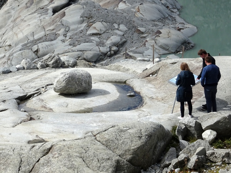 Der Rhonegletscher ist eines von vielen Beispielen für den dramatischen Rückgang der Gletscher. In den 70er-Jahren bin ich noch ca. 30 - 40 Meter nahezu ebenerdig vom Pavillon zur Eisgrotte gelaufen. Heute muß man einen Serpentinenweg hinuntergehen. Wo heute der kleine See ist, war damals dickes Eis.
