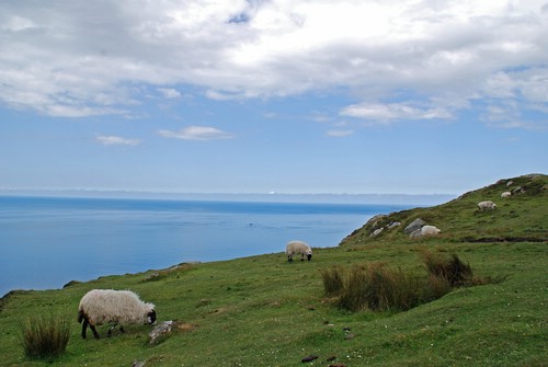 Auf der Weiterfahrt begegnen uns eine Menge freilaufender Schafe. Nun hat uns auch das pure Irland Gefühl erfasst und wir halten an um über das saftige Gras und zwischen den grasenden Schafen einen Blick auf die Klippen und das umliegende Land zu erhaschen.