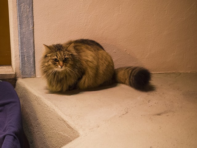 Beim Essen macht die Inhaberin eine Runde durch den Saal und begrüßt die Gäste. Als wir sie gesehen haben (wir kennen sie ja schon ein paar Jahre) sind wir erst mal erschrocken: sie hatte ein fettes blaues Auge, sah aus wie von einem Boxschlag. Sie hat dann auch gleich erzählt wie ihr das passiert ist: sie lag nachmittags mit einer Magengrippe im Bett fest schlafend und auf einmal springt ihr ihre Katze auf den Kopf tritt mit den Hinterfüßen aufs Auge und beißt ihr in die Nase. Kaum zu glauben oder? Sie war eine Woche lang das Gespött im Dorf hat sie erzählt (man muss sich mal vorstellen man geht mit einem Veilchen zum Arzt und sagt: das war meine Katze…). Die Hotelbesitzerin meinte die Katze habe sie wohl nicht erkannt weil sie ganz zugedeckt war und normalerweise nie tagsüber im Bett liegt und die Katze wollte wohl den Eindringling vertreiben