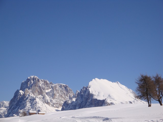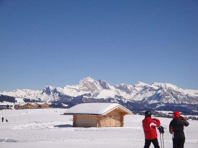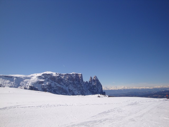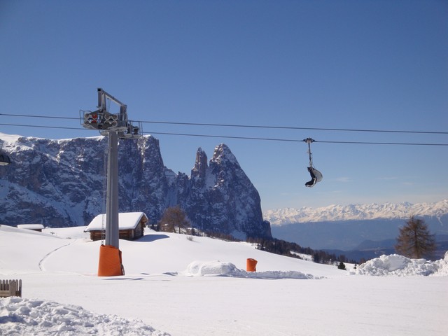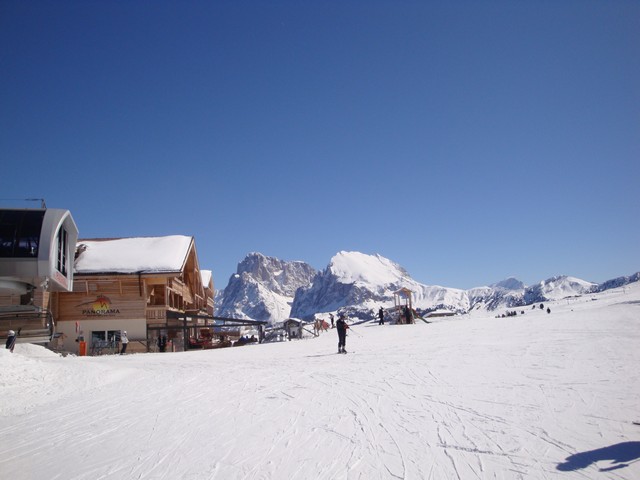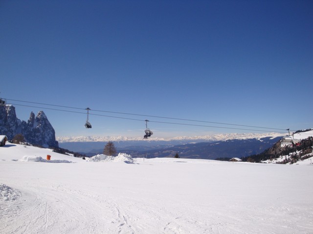 Heute ist wieder strahlendes Wetter und dankenswerterweise geht kein Wind und es hat auch ein paar Plusgrade. Ideales Skiwetter, gegen 10 Uhr brechen wir auf zur Gondelstation nach etwa 20 Minuten Fahrt ist man dann oben auf der Seiser Alm auf 1800 Meter. Die Gondelstation endet beim kleinen Ort Compatsch, der nur aus ein paar Hotels und Geschäften und Cafes besteht. Von dort nehmen wir den Panoramalift auf 2000 Meter Höhe, dort angekommen hat man folgenden herrlichen Blick: