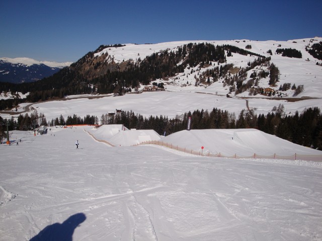 Auf der Abfahrt vom Laurinlift. Hier ist einer von etlichen Funparks. Von der Piste aus kann man den mutigen Skifahrern und Boardern beim Looping und Saltospringen zuschauen. Es gibt auch noch kleinere Schanzen und solche mit Metallkanten auf denen man langschlittern kann etc. pp. Für die Fans solcher Attraktionen ist hier sehr viel geboten. Daneben gibt es auch spezielle Pisten für Schlittenfahrer, es fehlt an nix