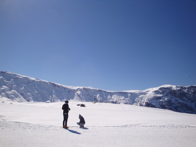 Der Himmel ist zwar wunderbar blau aber es ist ziemlich kalt und es geht ein eisiger Wind, also nix für uns Rekonvaleszenten. Die beiden Studenten werden zum Skifahren auf den Berg geschickt,  mein Freund und ich werden ein bisschen spazieren gehen und dann im Hallenbad relaxen.