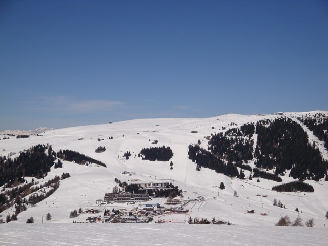 Hier der Blick vom Panoramalift runter nach Compatsch: wenn man genau hinschaut sieht man in der Mitte des Ortes die Bergstation der Gondelbahn. Dieses Jahr lag sehr viel Schnee, es gab auch schon Jahre wo alles grün war nur die Pisten dank Skikanonen weiß.