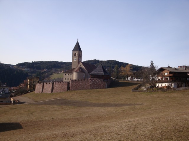 gegen drei Uhr bin ich dann nach Seis runter gefahren, ich wollte noch die Sonne auf unserem Balkon am Hotelzimmer genießen. Von der Talstation bin ich zum Hotel gelaufen, es gibt einen Fußweg, in 5 Minuten ist man im Ortszentrum. Ein Foto von der Kirche von der Hauptstrasse aus: