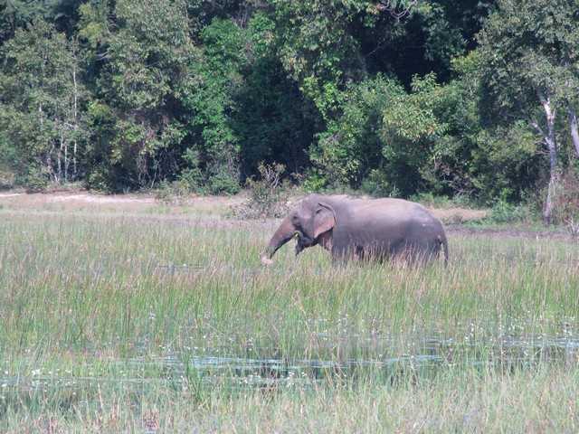 Nach der Pause fahren wir zum nächsten See und haben Glück: wir entdecken eine Elefanten: