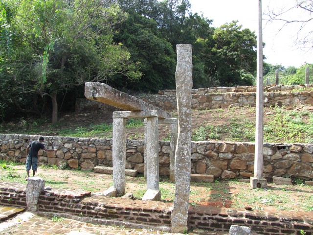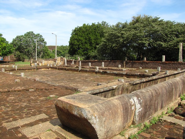 Man sieht Überreste eines großen Speisesaals für Mönche mit Wasserleitung und ein Reistrog wie ein riesiger Schweinetrog.