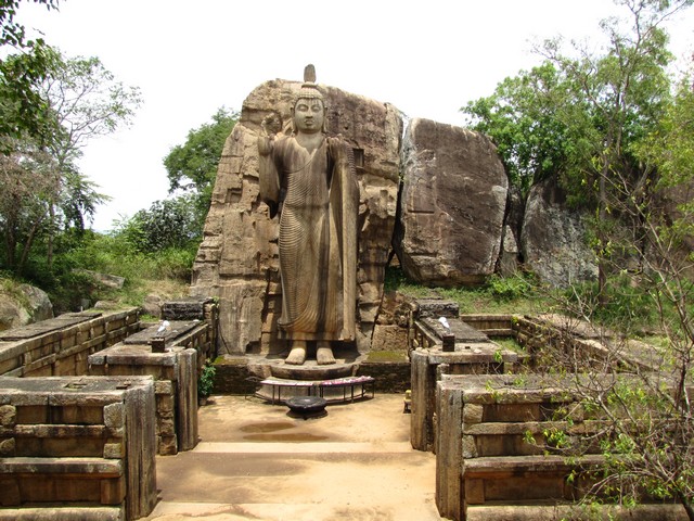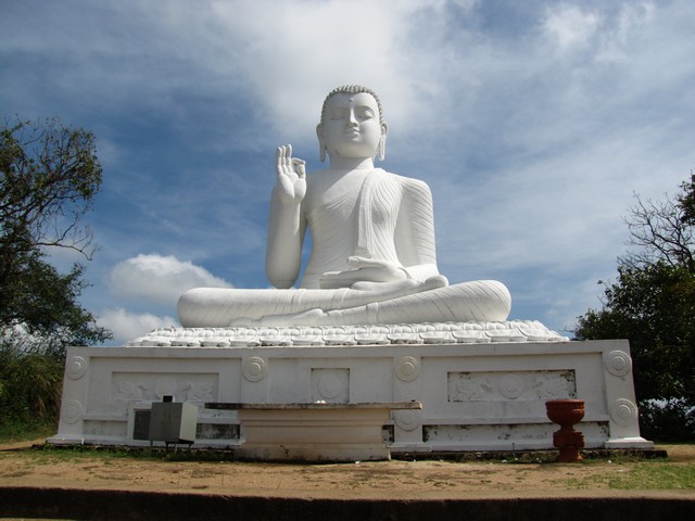Danach fahren wir nach Aukana, dort steht eine einzelne Buddhastatue in einem Stück aus dem Fels gehauen. Sie ist 12 m hoch und nach der Zerstörung der Statuen von Bamyan die größte aus einem Fels gehauene Budhastatue weltweit.