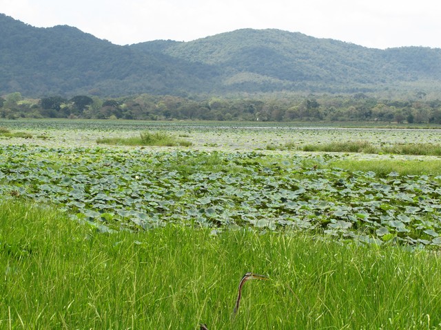 ein Uferstück ist mit Lotusblumen zugewachsen und irgendein Vogel schaut hier raus