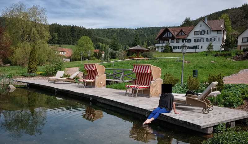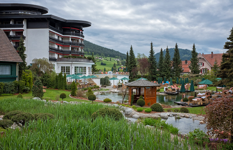 Das seit Generationen im Familienbesitz befindliche Hotel gehört zu den besten 5-Sterne- Ferienhotels in Europa. Die Geschichte des Bareiss begann mit einer 6-Zimmer-Pension in den 50er Jahren. Nach 54 (!) Bauabschnitten innerhalb 60 Jahren hat es heute 41 Zimmer, 10 Suiten und 48 Appartements (bis zu 120 qm), ein 2.400 qm großes Spa, zwei Innen- und zwei Außenpools sowie einen Naturbadeteich. Die herrlich angelegte Garten- und Parkanlage fügt sich schön in die Umgebung ein. Bei warmen Frühlingstemperaturen sitzen wir bei Kaffee und Schwarzwälder entspannt im Garten. Die Gäste können zwischen vier Restaurants wählen – das Hotelrestaurant, die Dorfstuben, die Kaminstube und das 3-Sterne-Restaurant Bareiss. Die rustikale Einrichtung des Hotels mag nicht jedermanns Geschmack treffen, passt aber in die Region der Bollenhüte. Der herzliche und aufmerksame Hotelservice ist ein Markenzeichen des Hotel Bareiss und nahezu perfekt. Alles perfekt im Bareiss? Nein, auch im Bareiss läuft nicht alles rund. Der Zugang zum Garten ist zu verwinkelt und das Spa schließt bereits um 19.00 Uhr.