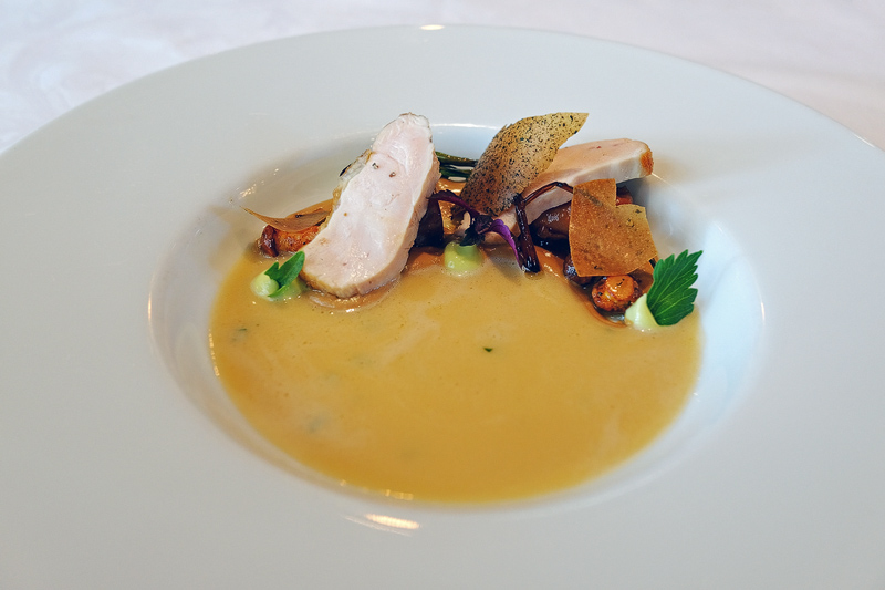 Cassolette vom Schwarzfederhuhn mit Pfifferlingen und Liebstöckel-Sud. 8/10